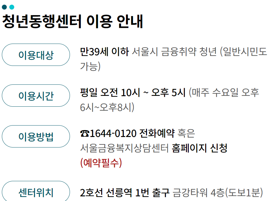 - 서울시복지재단 청년동행센터나 서울금융복지상담센터에서 상담을 받을 수 있습니다.