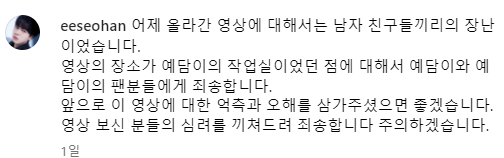 "어제 올라간 영상에 대해서는 남자 친구들끼리의 장난이었습니다. 영상의 장소가 예담이의 작업실이었던 점에 대해서 예담이와 예담이의 팬분들에게 죄송합니다. 앞으로 이 영상에 대한 억측과 오해를 삼가주셨으면 좋겠습니다. 영상 보신 분들의 심려를 끼쳐드려 죄송합니다 주의하겠습니다. 두려움과 죄송스러운 마음에 말을 아낀 저의 해명이 오히려 논란이 된 것 같아 용기 내어 다시 글을 올립니다."